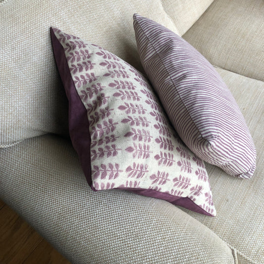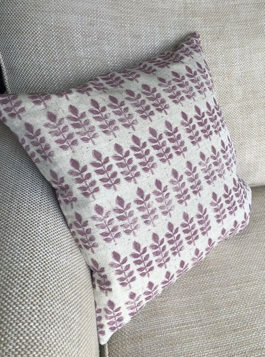 Aubergine Leaf Print Linen & Velvet Square Cushion