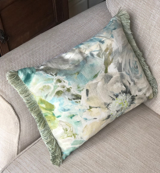 Green Fringe Floral Linen Cushion