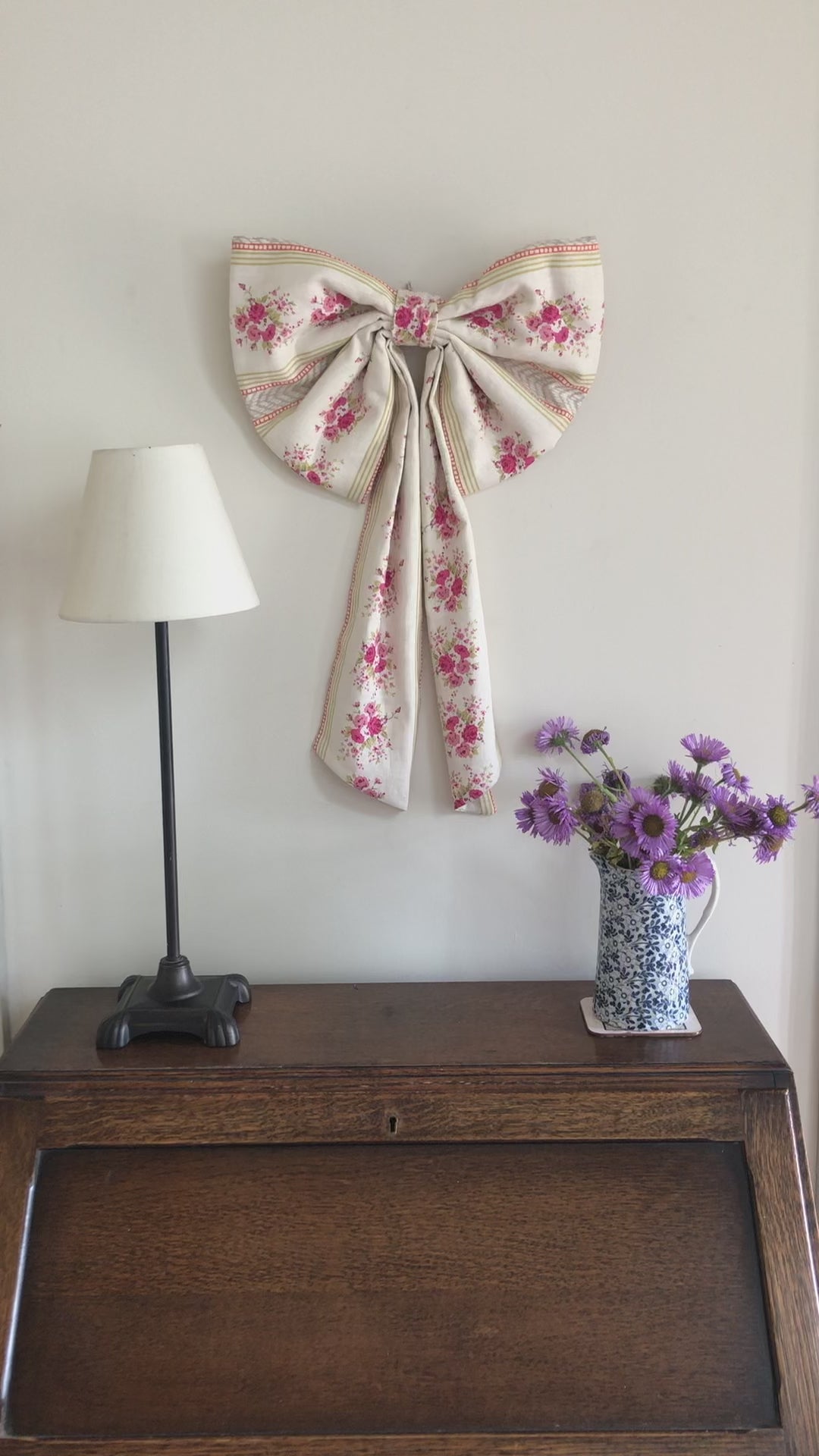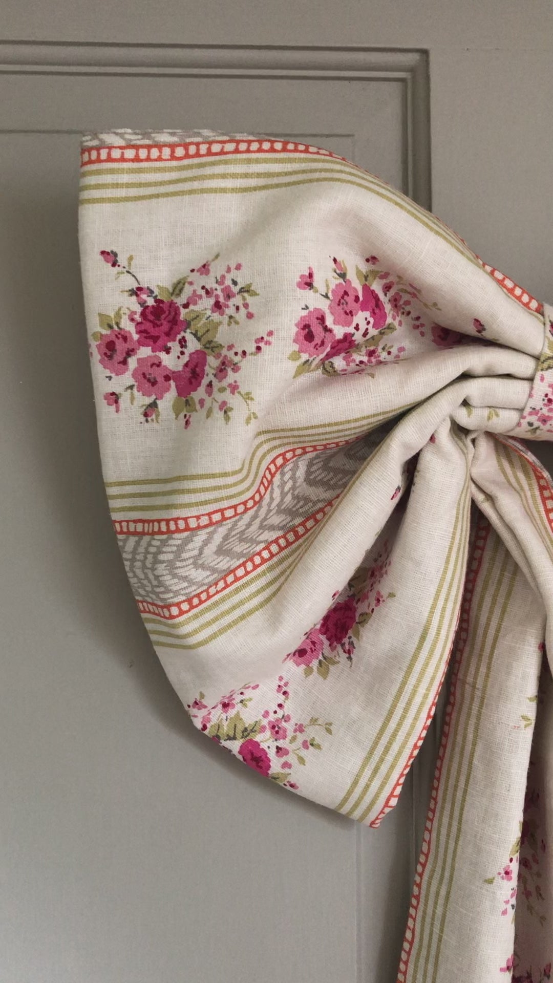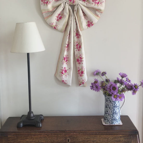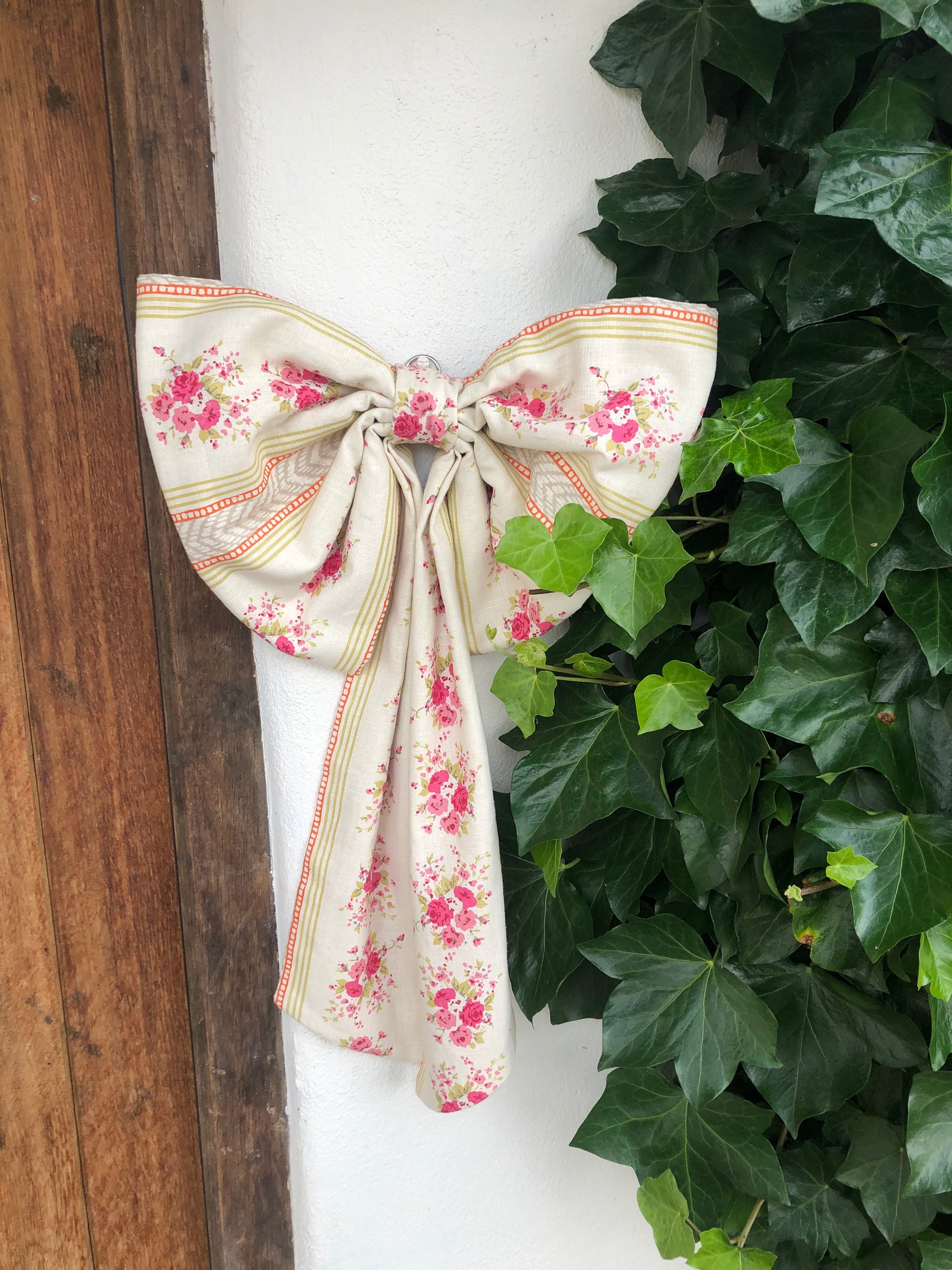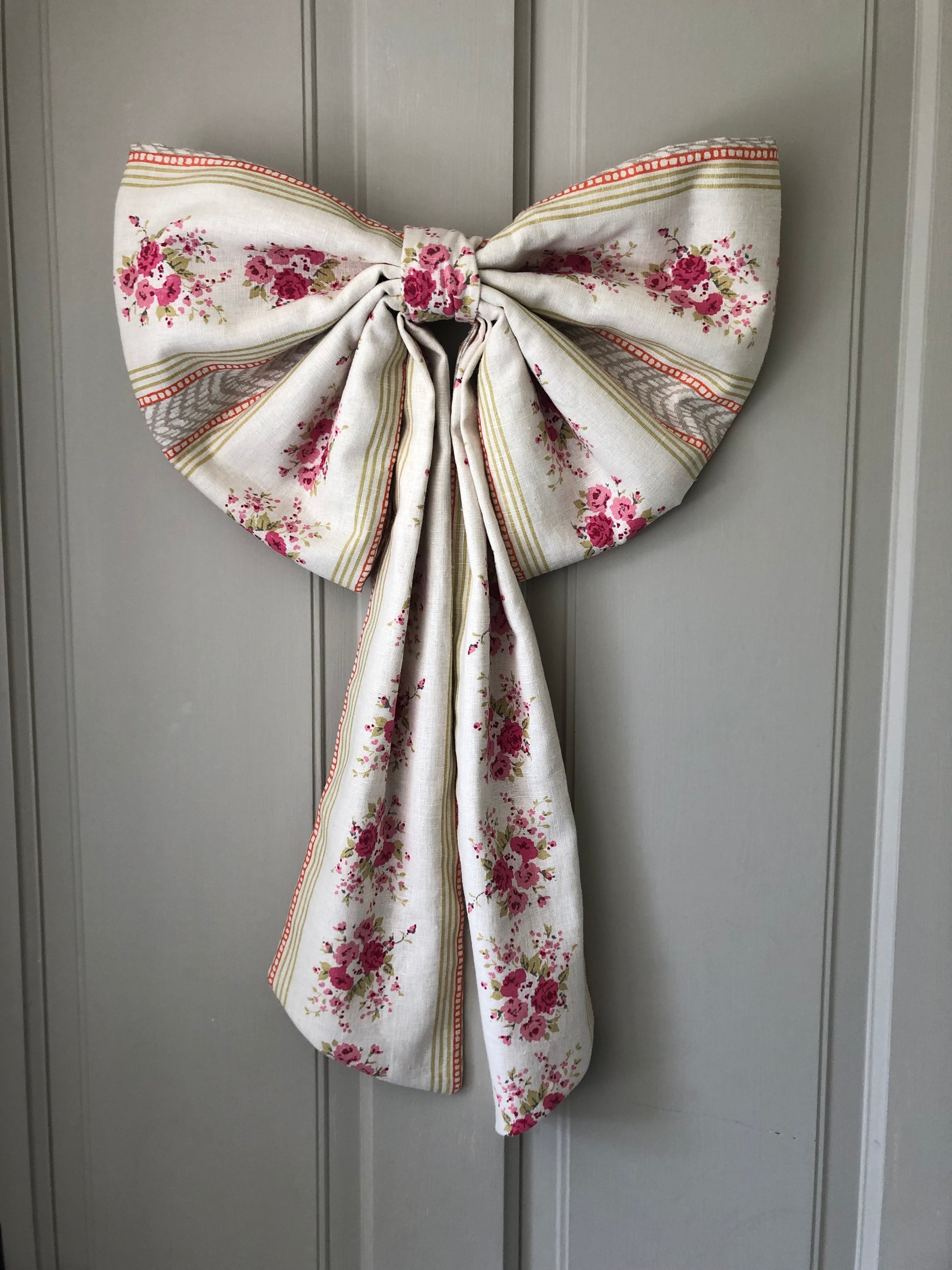 These double layered linen bows feature a delicate rambling rose design. They have wadding for added structure and a brass D-ring with a length of ribbon on the reverse for hanging options.